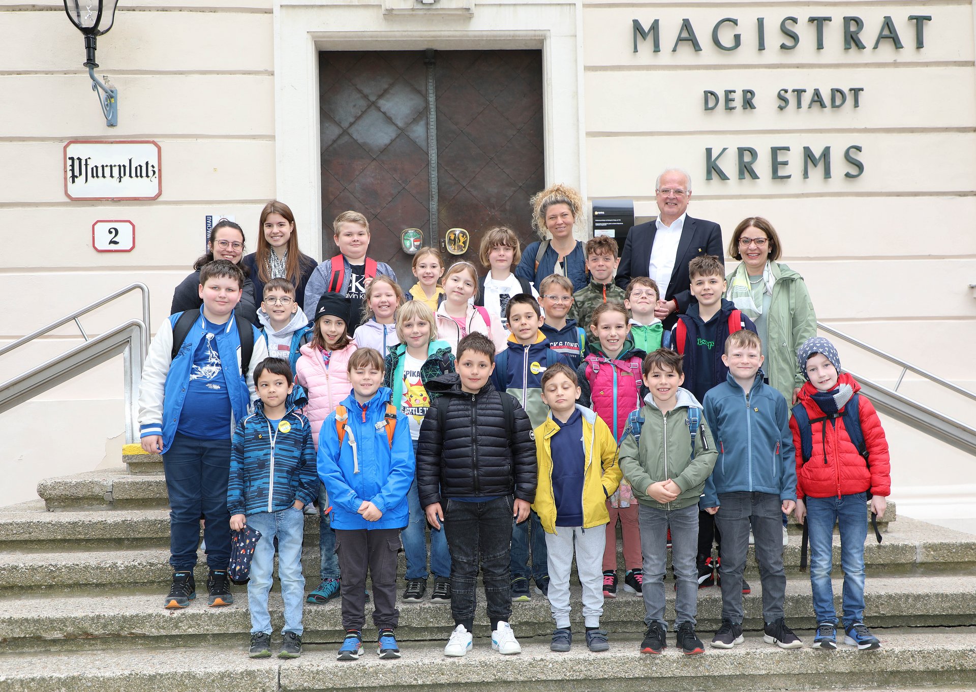 Foto 1: Kinder der Praxisvolksschule Krems-Mitterau KPH Wien/Krems mit zwei Studentinnen, deren Integrationslehrerin Ulrike Binder-Michalek und VL Dipl. Päd. Gabriele Kodym beim Bürgermeister im Rathaus (von links oben).