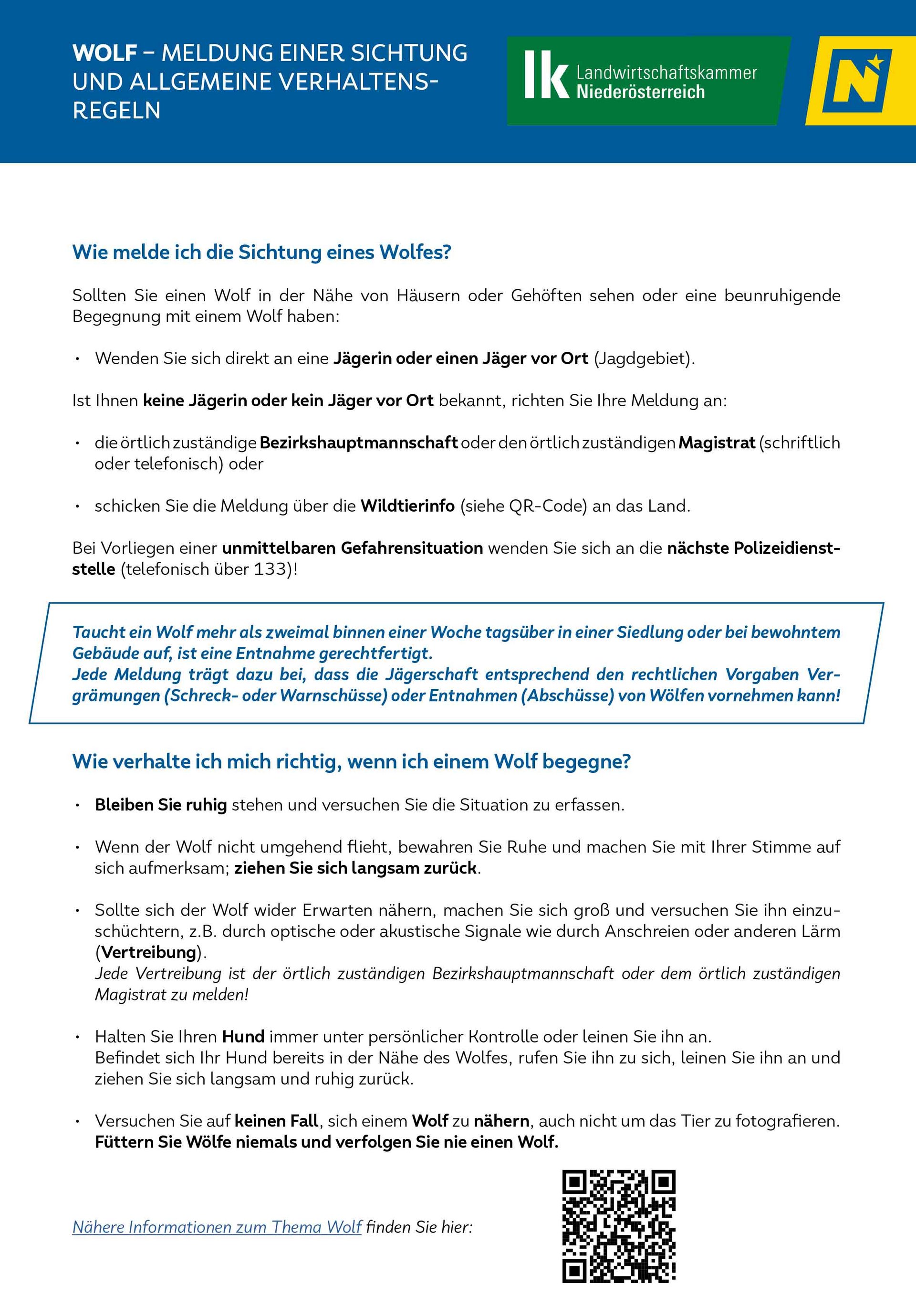 Grundsätzlich stehen Wölfe in Österreich unter strengem Schutz. Taucht ein Wolf jedoch mehr als zweimal binnen einer Woche tagsüber in einer Siedlung oder bei bewohnten Gebäuden auf, ist eine Entnahme (Abschuss) gerechtfertigt. Jede Meldung über eine Sichtung des Tieres trägt dazu bei, dass die Jägerschaft entsprechend den rechtlichen Vorgaben Vergrämungen (durch Schreck- und Warnschüsse) und in weiterer Folge auch einen Abschuss des Tieres vornehmen kann.