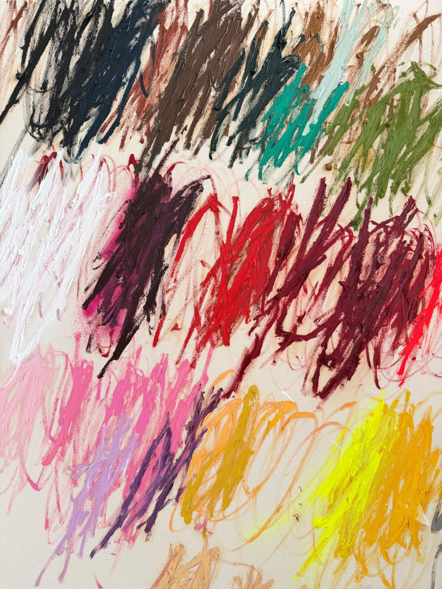 Die Verwendung von unbehandeltem Leinen verstärkt die Materialität und Direktheit ihrer Arbeiten. Die rohe Oberfläche lässt die Farbe in unmittelbaren Kontakt mit dem Trägermaterial treten und betont die physische Dimension des Malprozesses. Diese Entscheidung verweist auf den Ursprung der Malerei als körperliche, zeitlich gebundene Handlung und verleiht den Arbeiten eine besondere Präsenz und Authentizität.