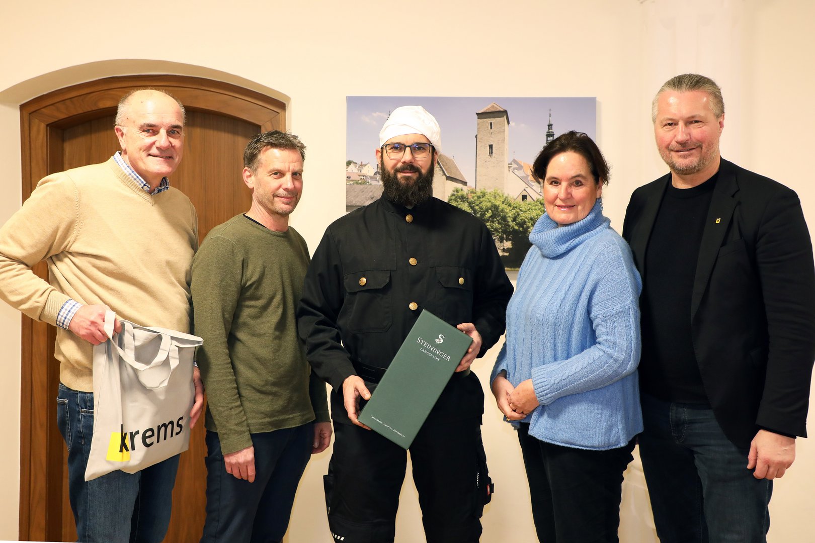 Die Rauchfangkehrer Hubert Reder, Herwig Fröch und Stefan Teufner, Rauchfangkehrerin Sonja Hockauf-Bartaschek zu Gast bei Bürgermeister Peter Molnar im Rathaus – von links.