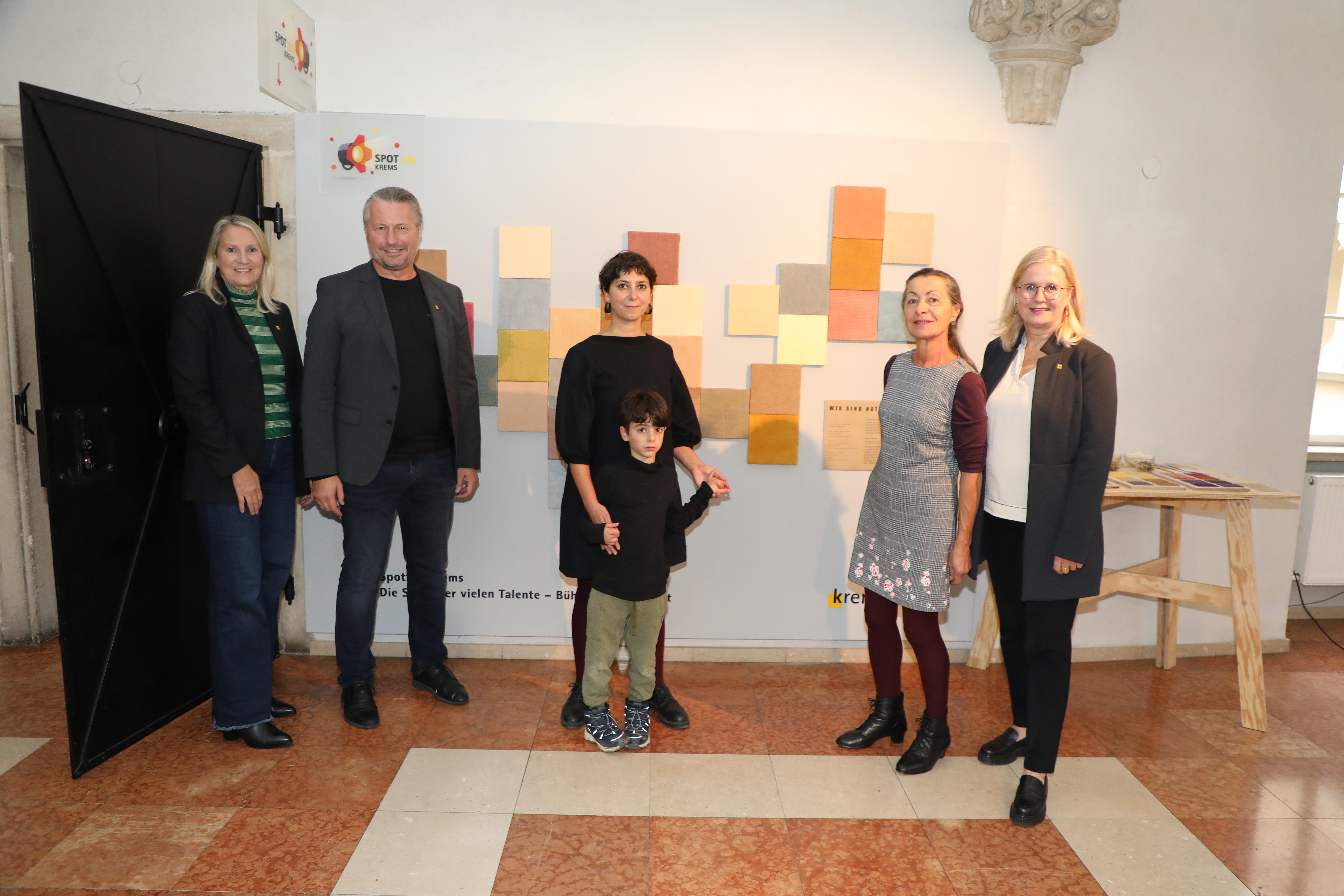 Präsidialamtsleiterin Rosemarie Bachinger, Bürgermeister Peter Molnar, Künstlerin Viviana Schimmenti mit Sohn René, Margit Werner Pietsch und Kulturgemeinderätin Elisabeth Kreuzhuber bei der Ausstellungseröffnung im Rathausfoyer – von links. Größe: 6720 x 4480 Px 7.53 MB © Stadt Krems Download