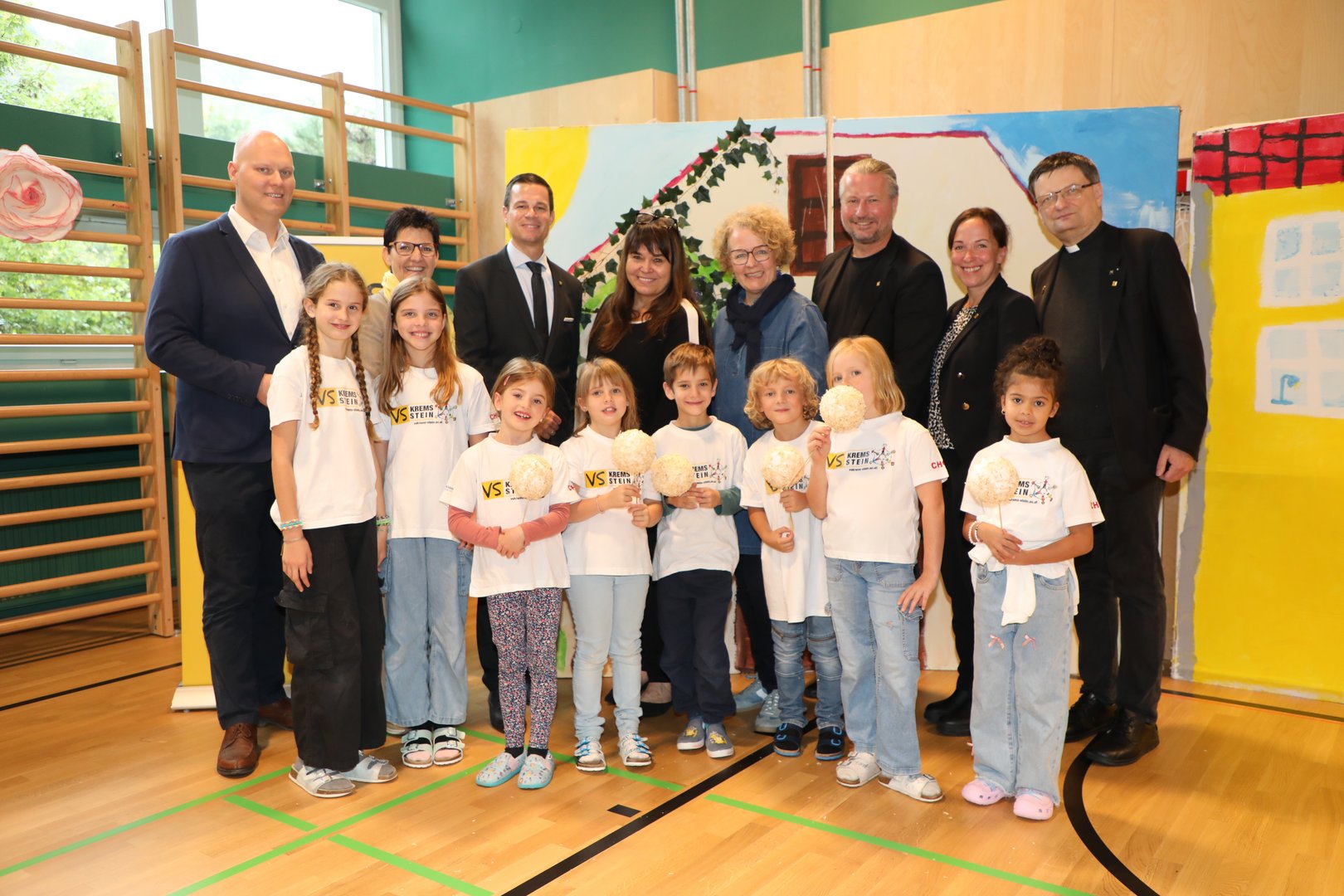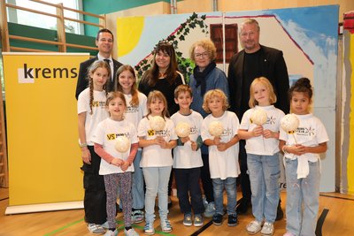NÖ Bildungsdirektor Karl Fritthum, Direktorin Marianne Stromberger, Landesrätin Christiane Teschl-Hofmeister, Bürgermeister Peter Molnar, Sport- und Jugend-stadträtin Bernadette Laister und Pfarrprovisor Matthias Martin mit den Schüler:innen Edyth Chapman, Lilly Attwood, Tilia Rücker, Marie Beer, Simon Gruber, Anton Fahrngruber, Mona Gabler-Rudolf und Shamsse Hamanma – von links.