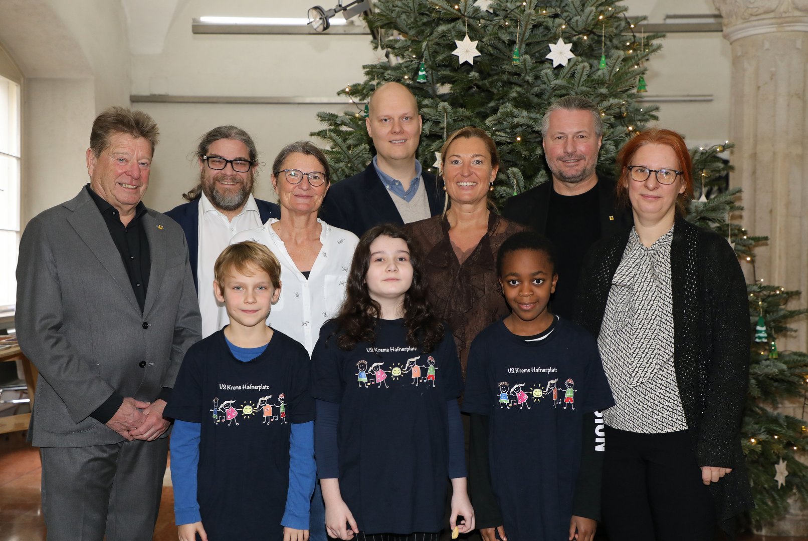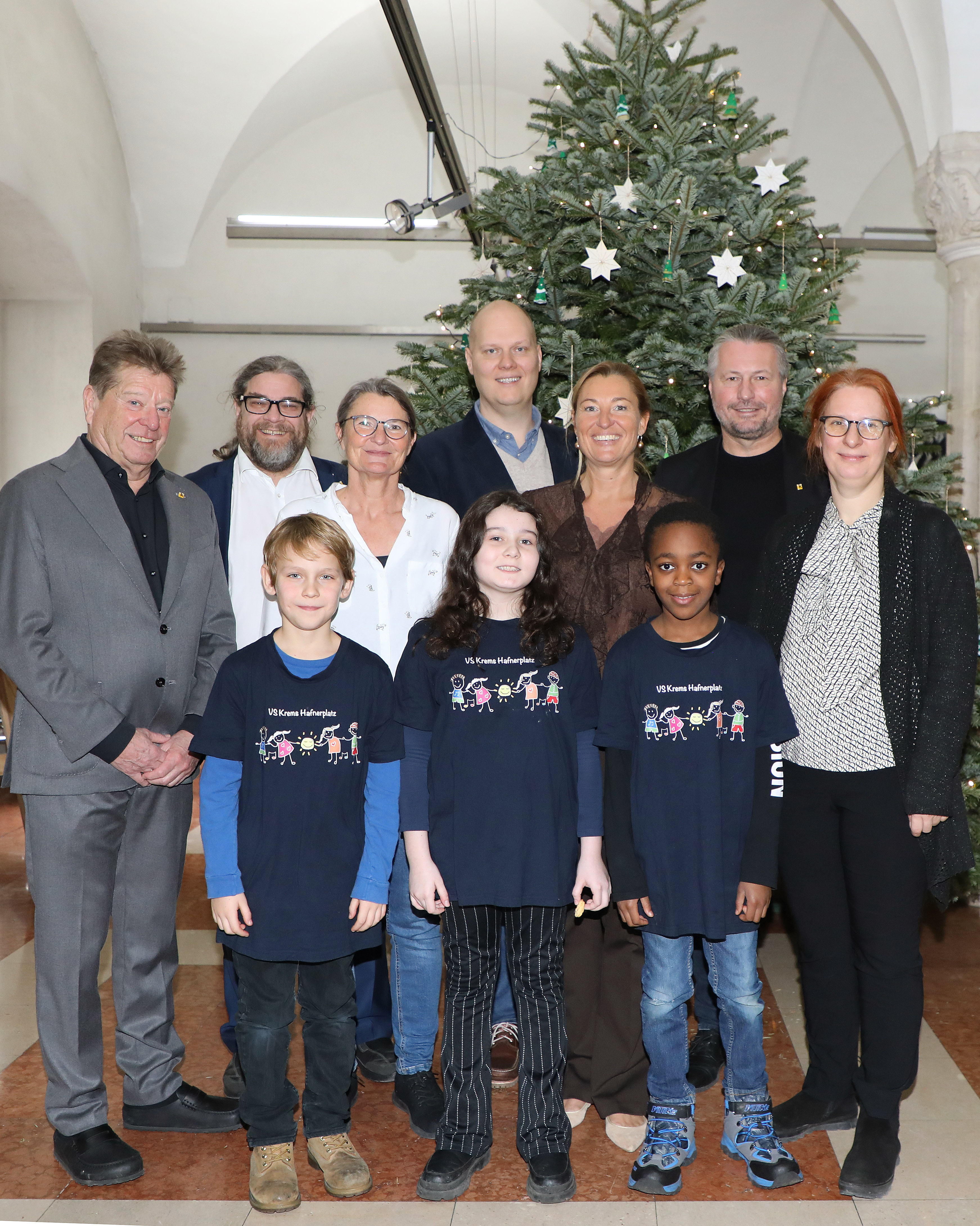 Weihnachtlicher Empfang im Rathausfoyer mit Stadtrat Helmut Mayer, Pianist Klaus Bergmaier, Lehrerin Andrea Huber, Stadtrat Martin Zöhrer, Schulleiterin Daniela Ebner, Bürgermeister Peter Molnar und Chorleiterin Karin Langhammer (hinten v. l.) sowie den Schüler:innen Juri Vascom, Mila Blauensteiner und Frederick Osakwe (vorne v. l.).