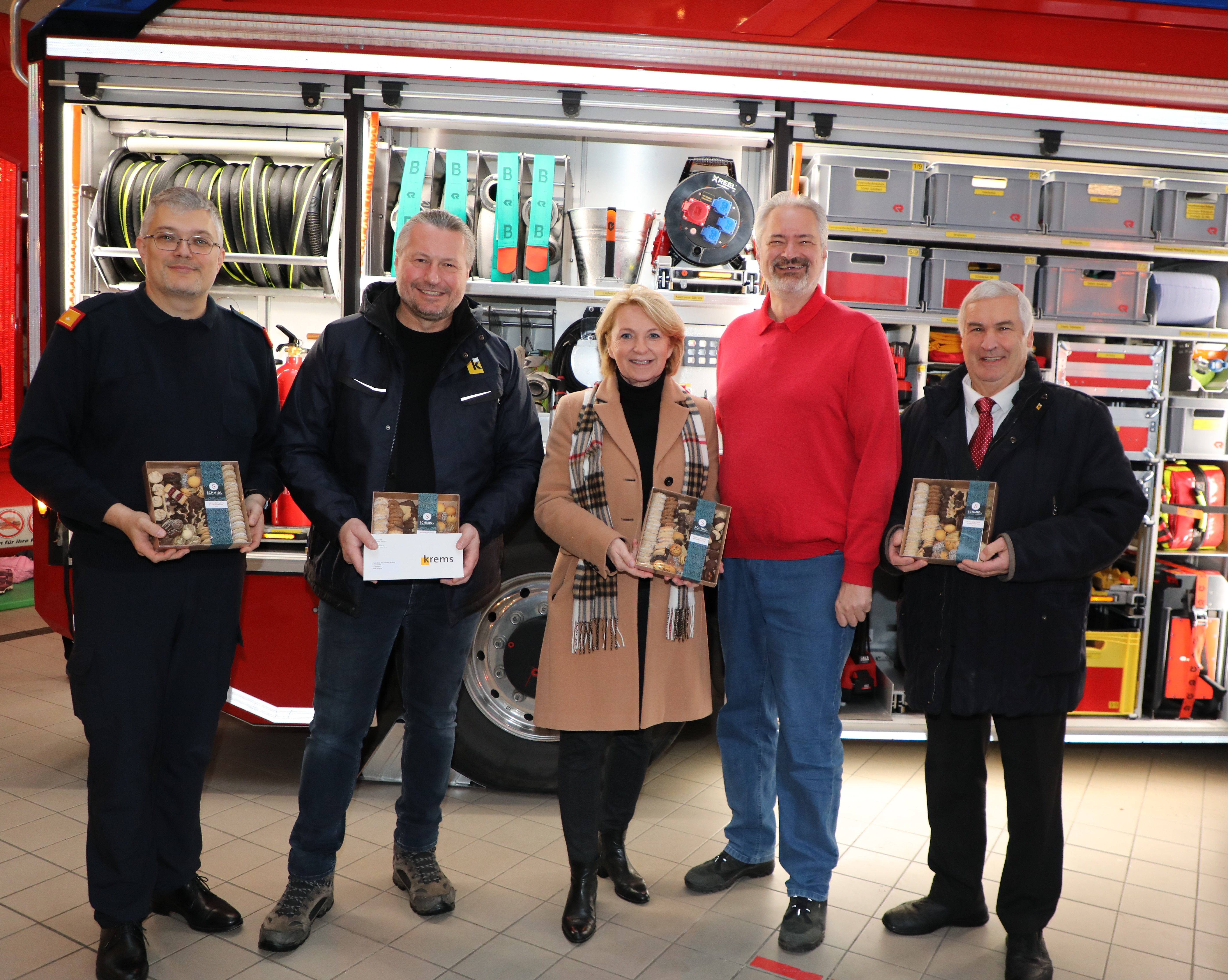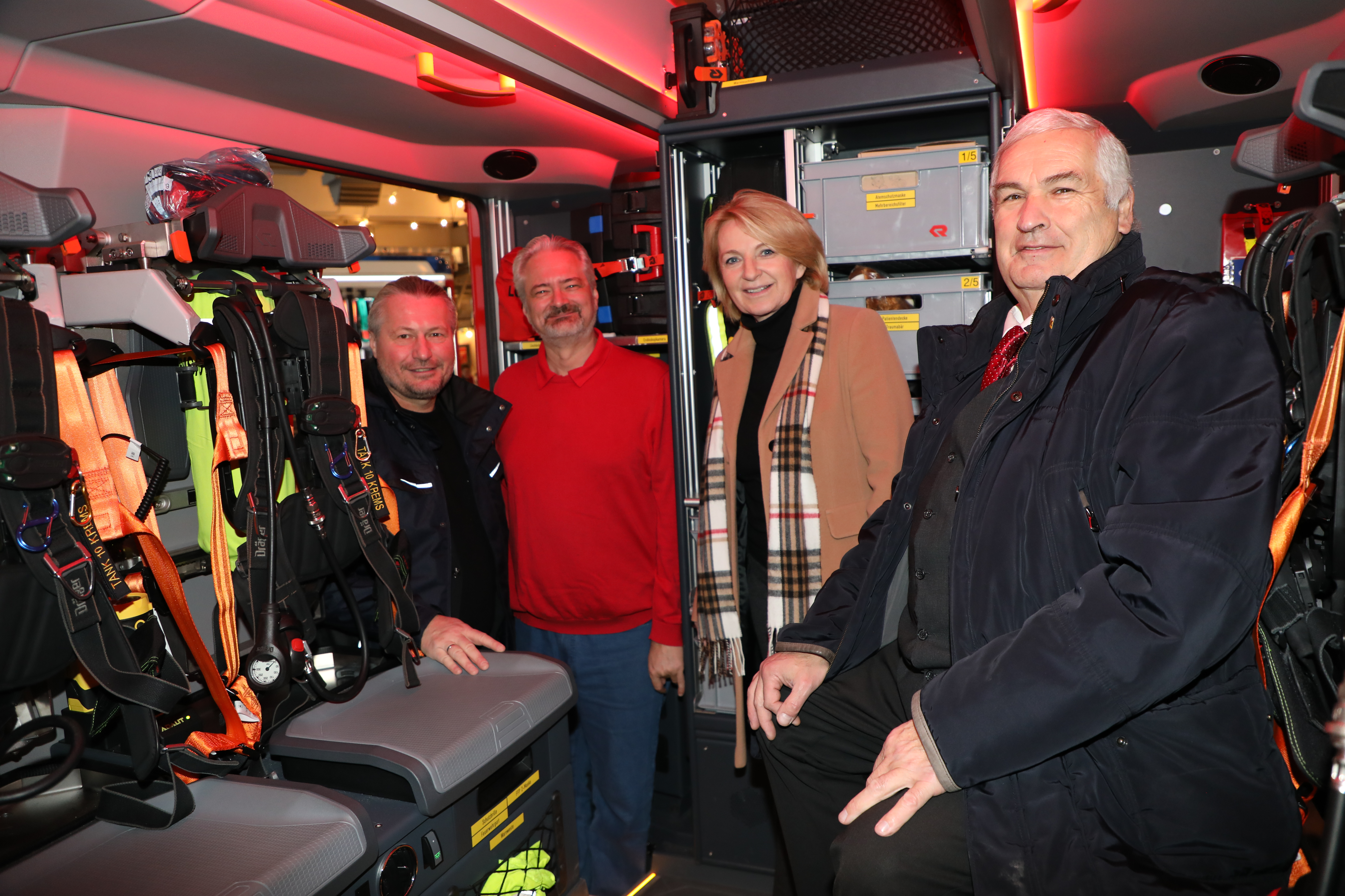 Die Feuerwehr Krems hatte an Heiligabend für Besucher:innen geöffnet. Wie viele andere Gäste auch erkundeten die Vertreter:innen der Stadt den ganzen Stolz der Florianis, das neue elektrische Tanklöschfahrzeug „Tank 10“. Im Bild: Bürgermeister Peter Molnar, Kommandant Gerhard Urschler, Vizebürgermeisterin Eva Hollerer sowie Gemeinderat und Sicherheitsbeauftragter Andreas Ettenauer – von links.