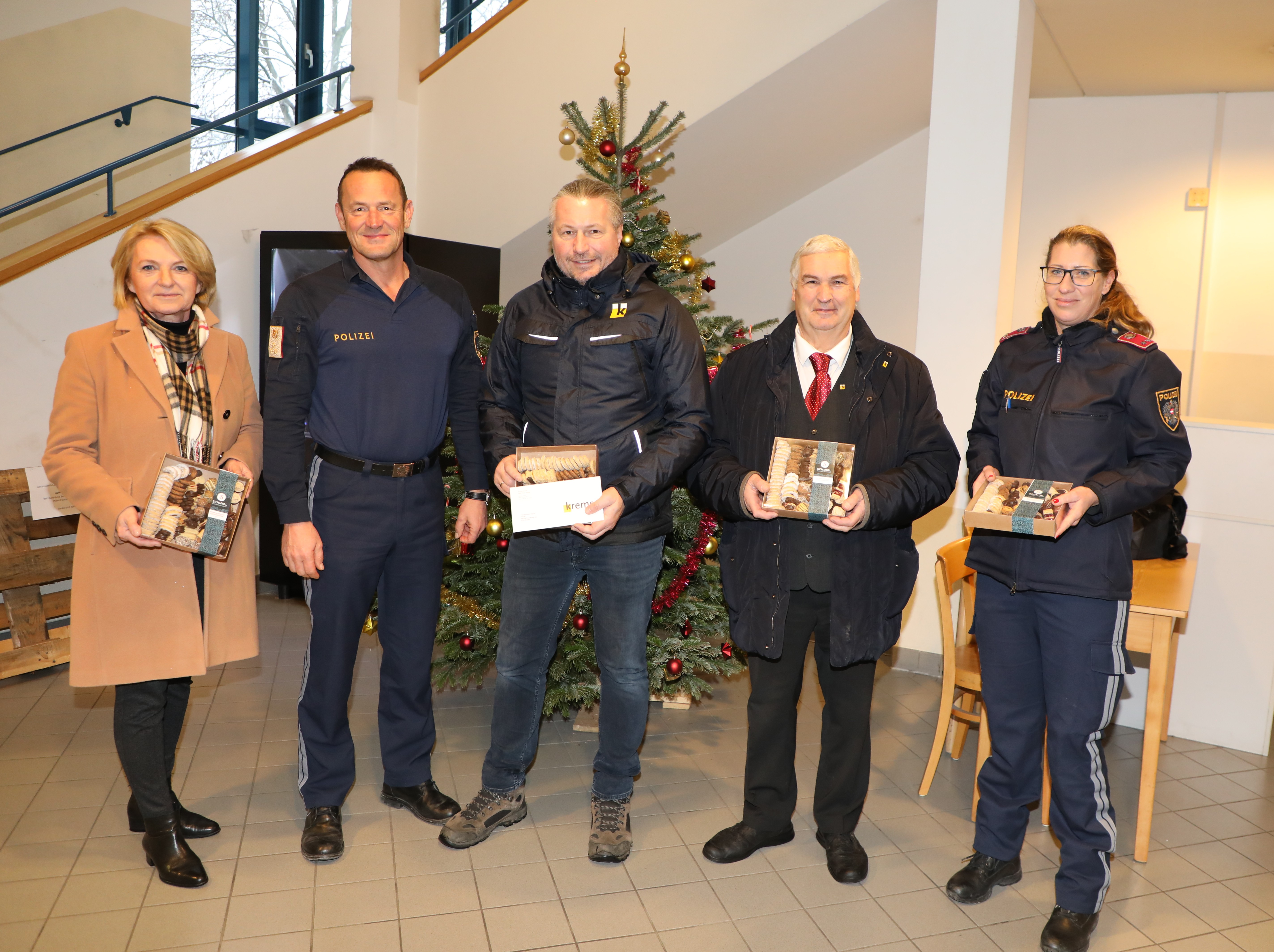 Die Stadtführung bedankt sich bei der Polizei Krems für die wertvolle Arbeit. Im Bild: Vizebürgermeisterin Eva Hollerer, der Kremser Polizeikommandant Robert Weidenauer, Bürgermeister Peter Molnar, Gemeinderat und Sicherheitsbeauftragter Andreas Ettenauer sowie eine Polizeibedienstete, die am 24. Dezember im Dienst war – von links.