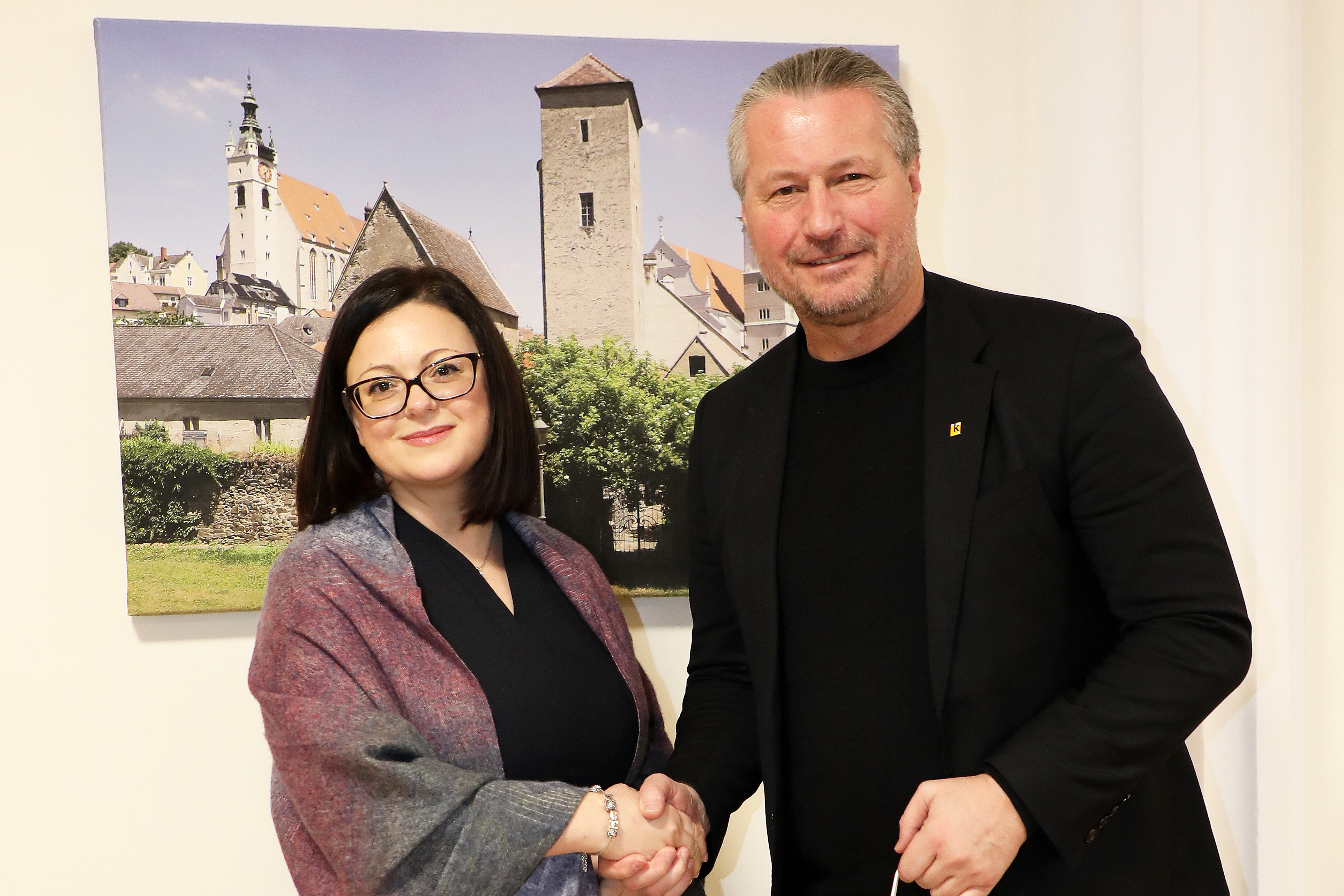 • Die moldauische Botschafterin Victoria Roșa und Bürgermeister Peter Molnar im Rathaus Krems