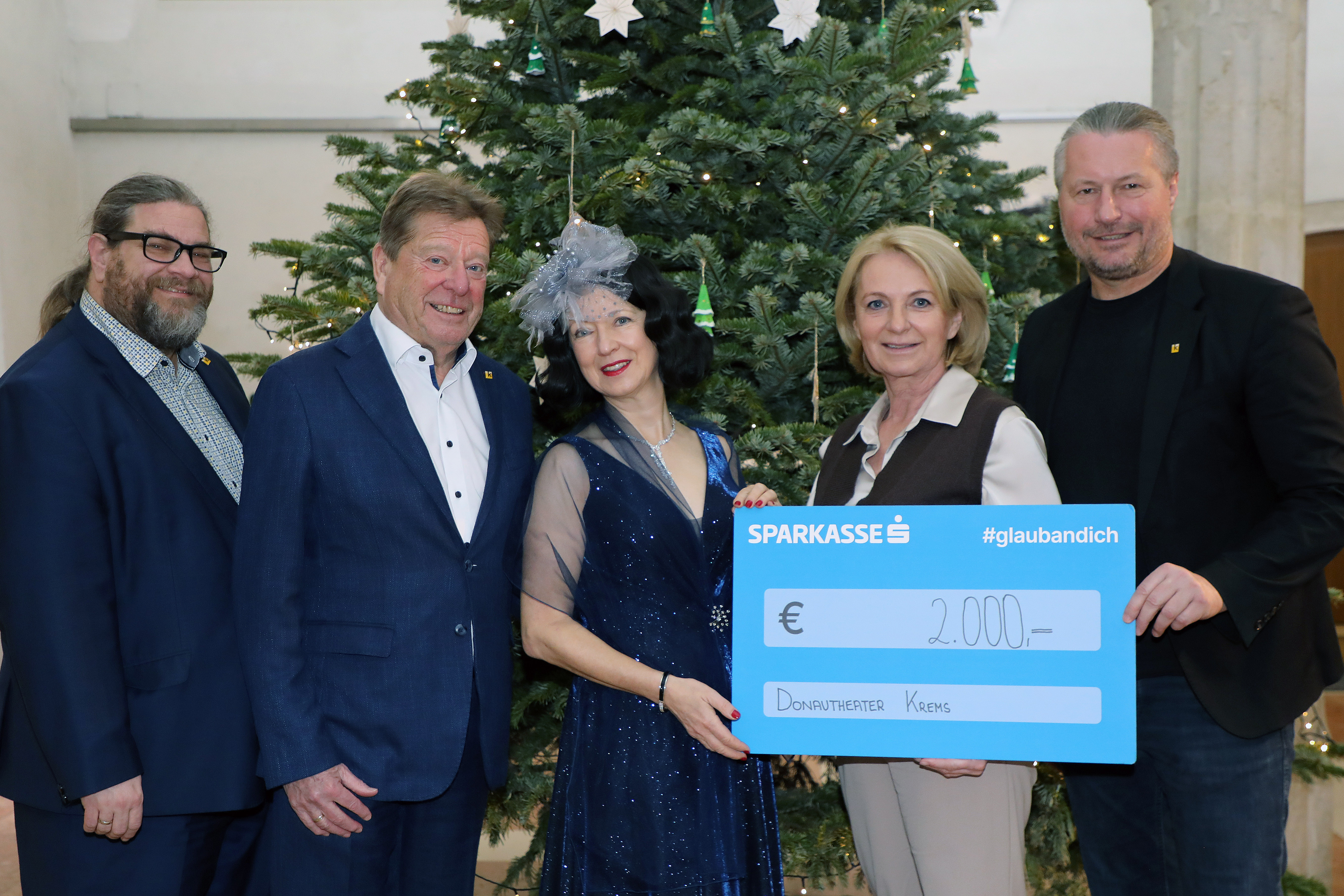 Pianist und Gemeinderat Klaus Bergmaier, Regisseur und Stadtrat Helmut Mayer, Hauptdarstellerin Hanna Mayer, Vizebürgermeisterin Eva Hollerer und Bürgermeister Peter Molnar bei der offiziellen Spendenübergabe im Rathaus – von links.