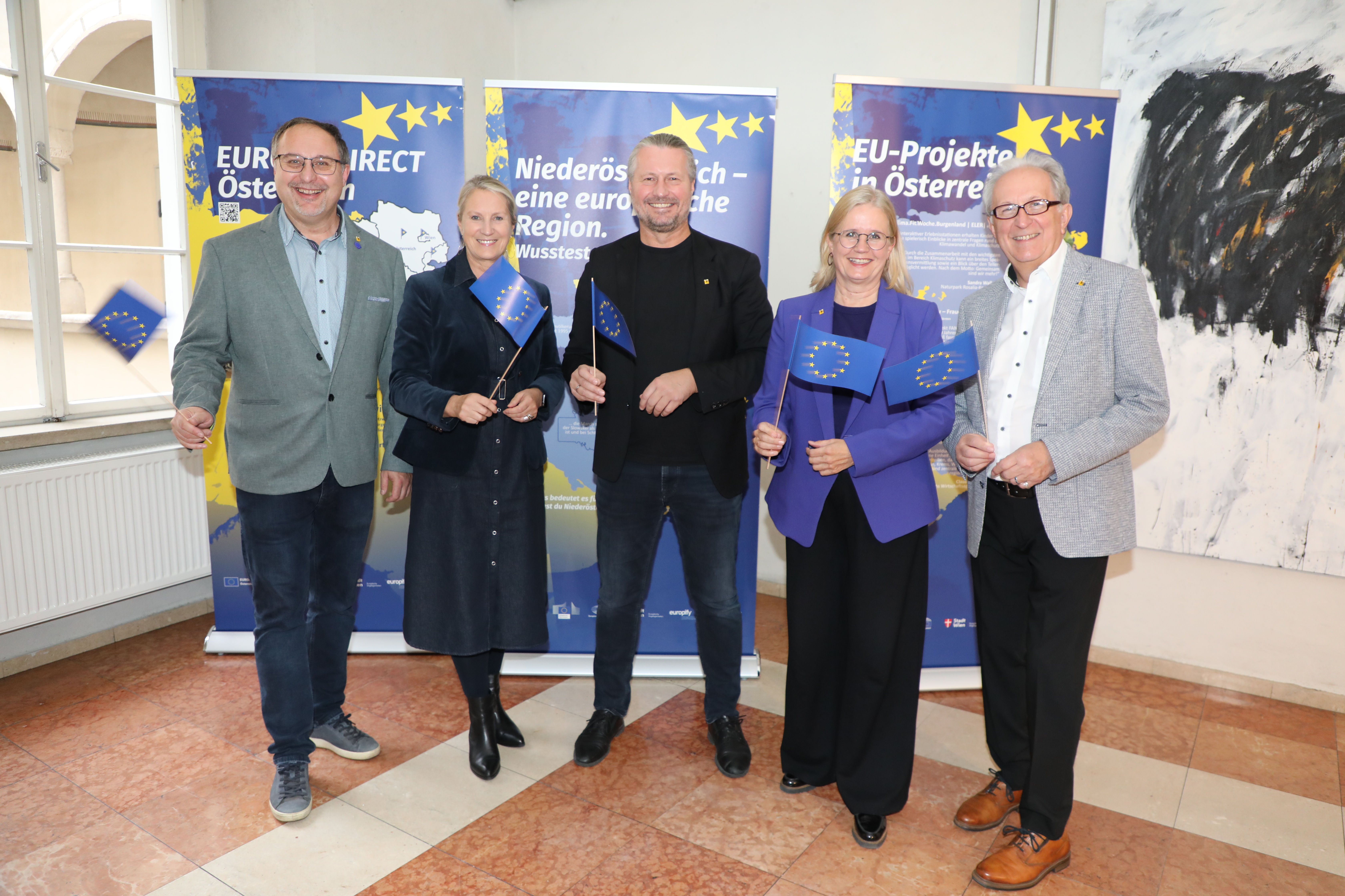 EU-Gemeinderat Robert Simlinger, Präsidialamtsleiterin Rosemarie Bachinger, Bürgermeister Peter Molnar, EU-Gemeinderätin Elisabeth Kreuzhuber und Stadtrat Günter Herz bei der Eröffnung der EU-Wanderausstellung im Kremser Rathaus (von links). Größe: 6720 x 4480 Px 8.13 MB © Stadt Krems Download