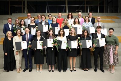 Die 15 ausgezeichneten Absolvent:innen im Kreise von (vordere Reihe v. l.) Magistrat-Bereichsleiterin Doris Denk, Brigitte Schuckert (NÖ Bildungsdirektion), Schulqualitätsmanagerin Susanne Ripper, (mittlere Reihe v. l.) Stadtrat Helmut Mayer, Bundesrätin Amelie Muthsam sowie (hintere Reihe v. l.) den Kremser Schuldirektor:innen Andreas Prinz (HTL), Barbara Faltl (BORG), Martina Geyer (HAK), Elisabeth Weigel (BRG Kremszeile), Elisabeth Buchinger-Glaser (BRG Ringstraße), Birgit Wagner (HLF) und Bärbel Jungmeier (Piaristengymnasium).
