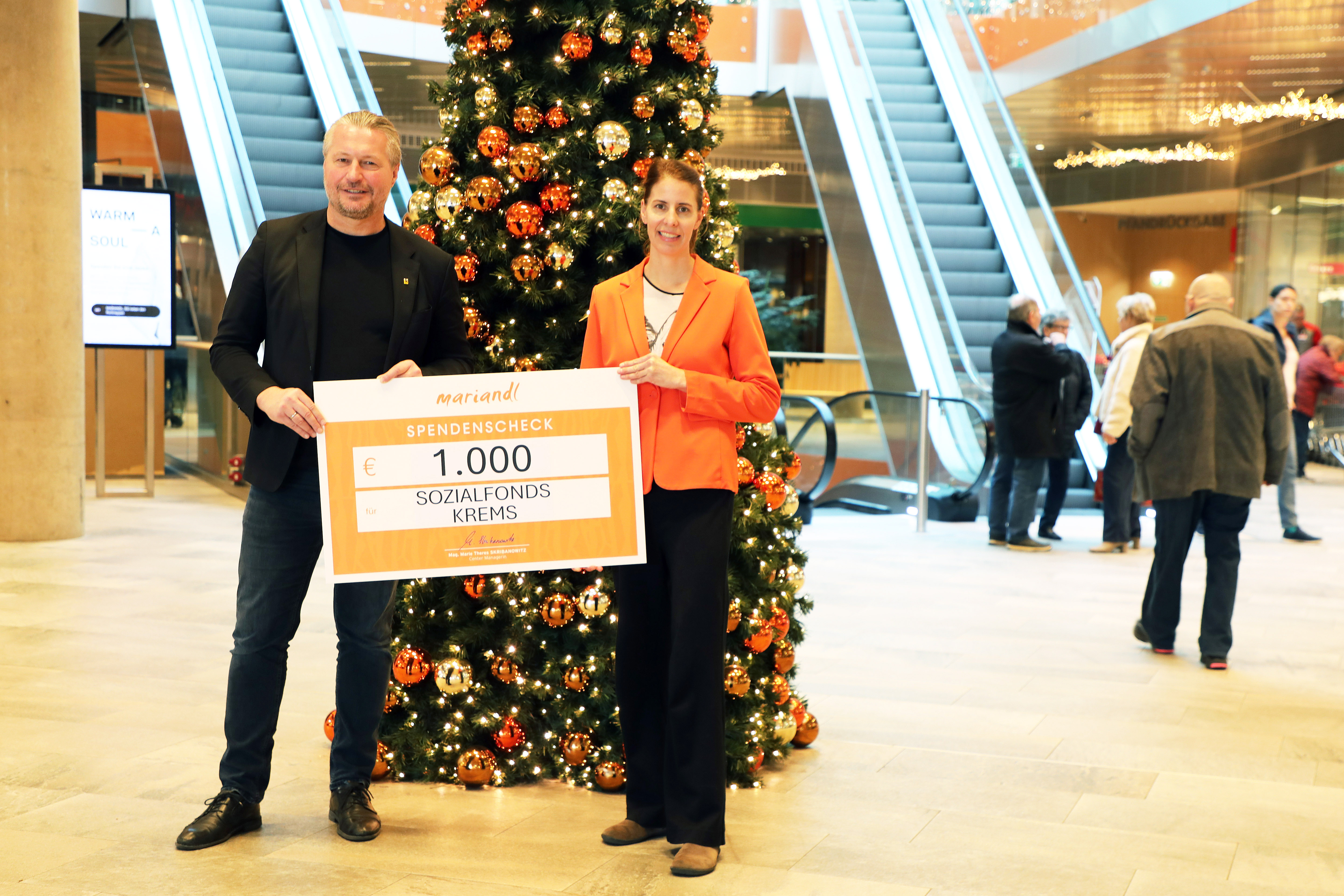 • Center-Managerin Marie-Theres Skribanowitz überreichte Bürgermeister Peter Molnar im Mariandl den symbolischen Spendenscheck.