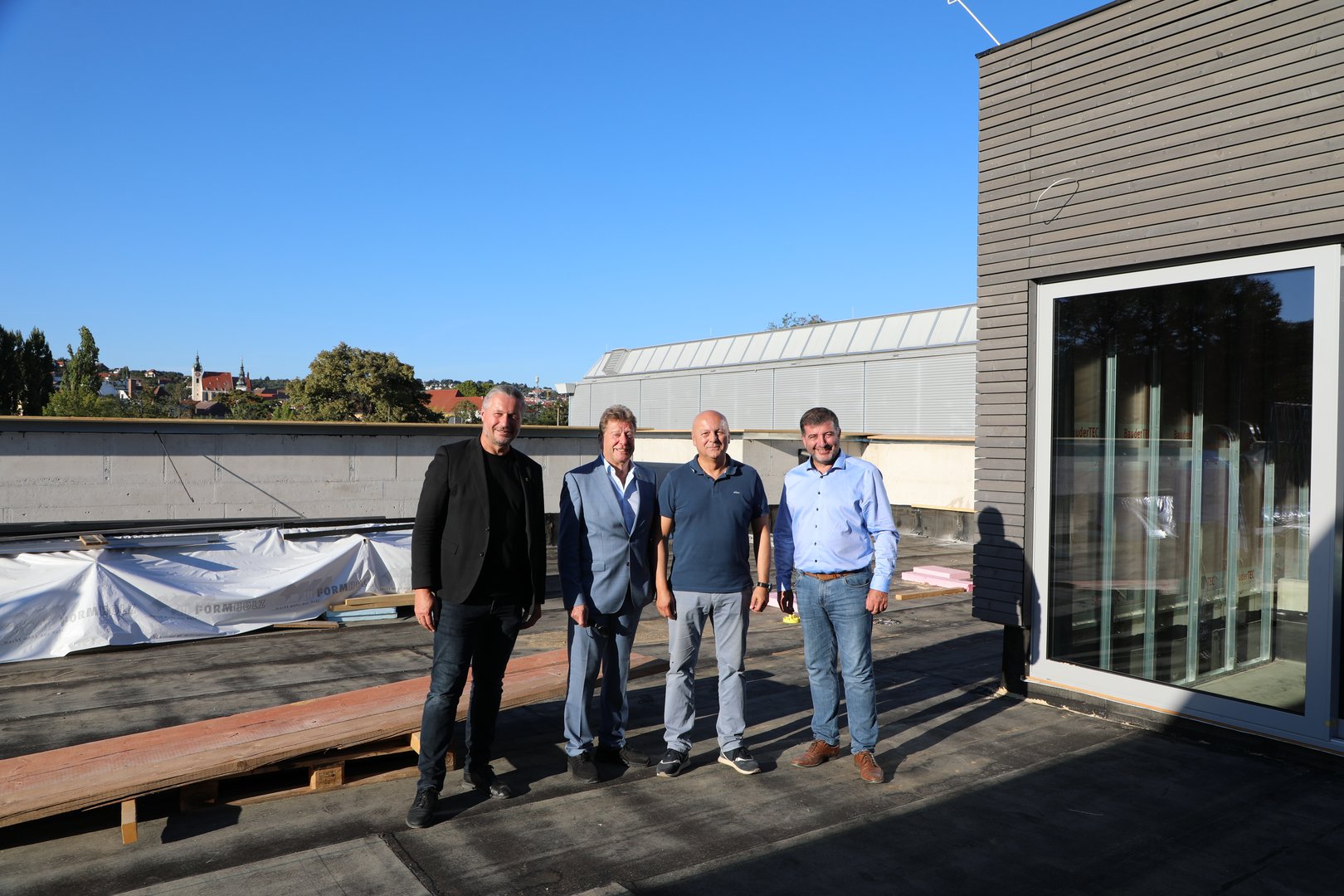 Bürgermeister Peter Molnar, Finanzstadtrat Helmut Mayer, Projekt- und Bereichsleiter Roland Dewisch sowie Landtagsabgeordneter Josef Edlinger (v. l.) am Dachgeschoß des neuen Kremser Hallenbades, wo künftig der Wellnessbereich mit Panoramablick zahlreiche Besucher:innen anlocken wird.