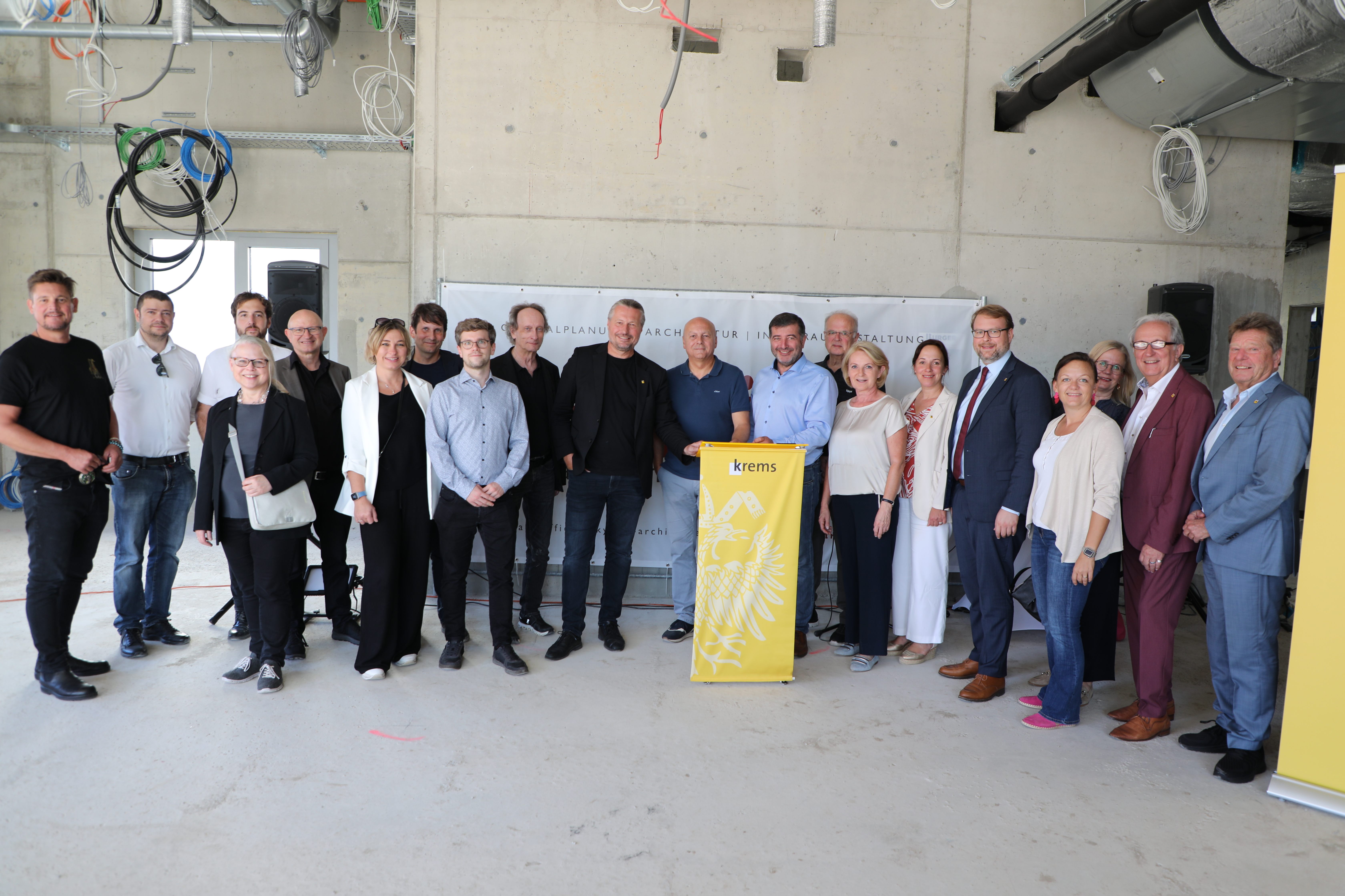 Projektverantwortliche, Gemeinderät:innen und das Team von skyline architekten bei der Gleichenfeier des neuen Kremser Hallenbads.