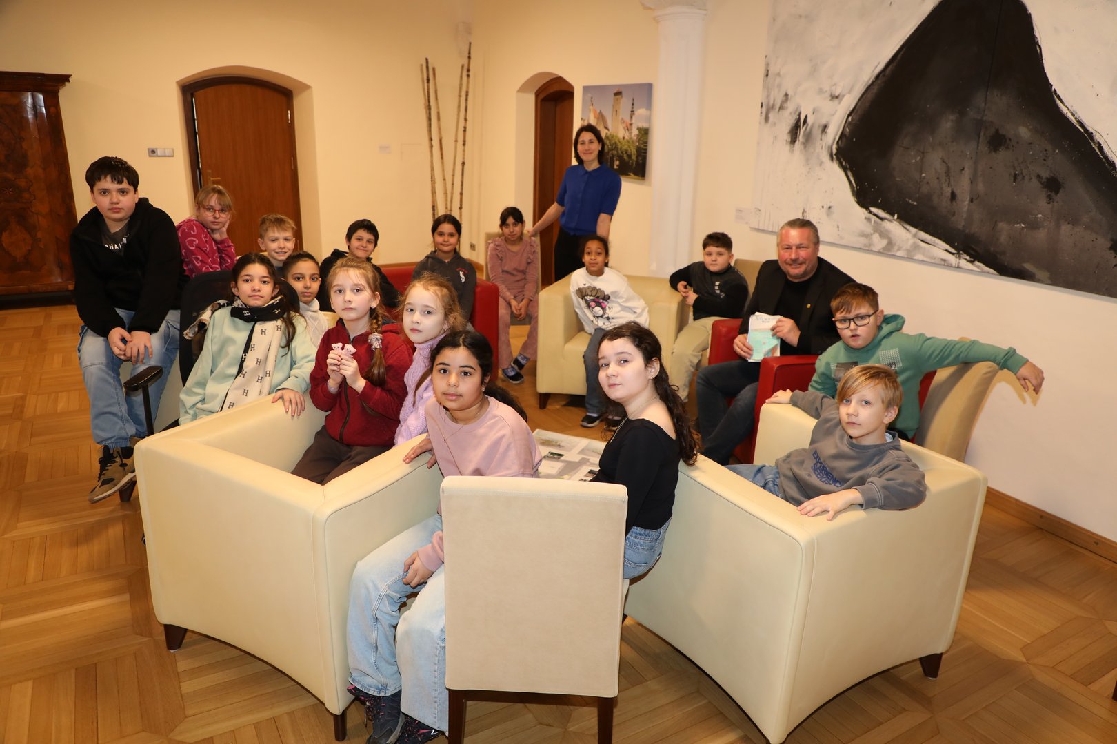 • Die Klasse 3a der Volksschule Hafnerplatz war mit ihrer Lehrerin Caroline Dorn bei Bürgermeister Peter Molnar im Rathaus zu Gast.