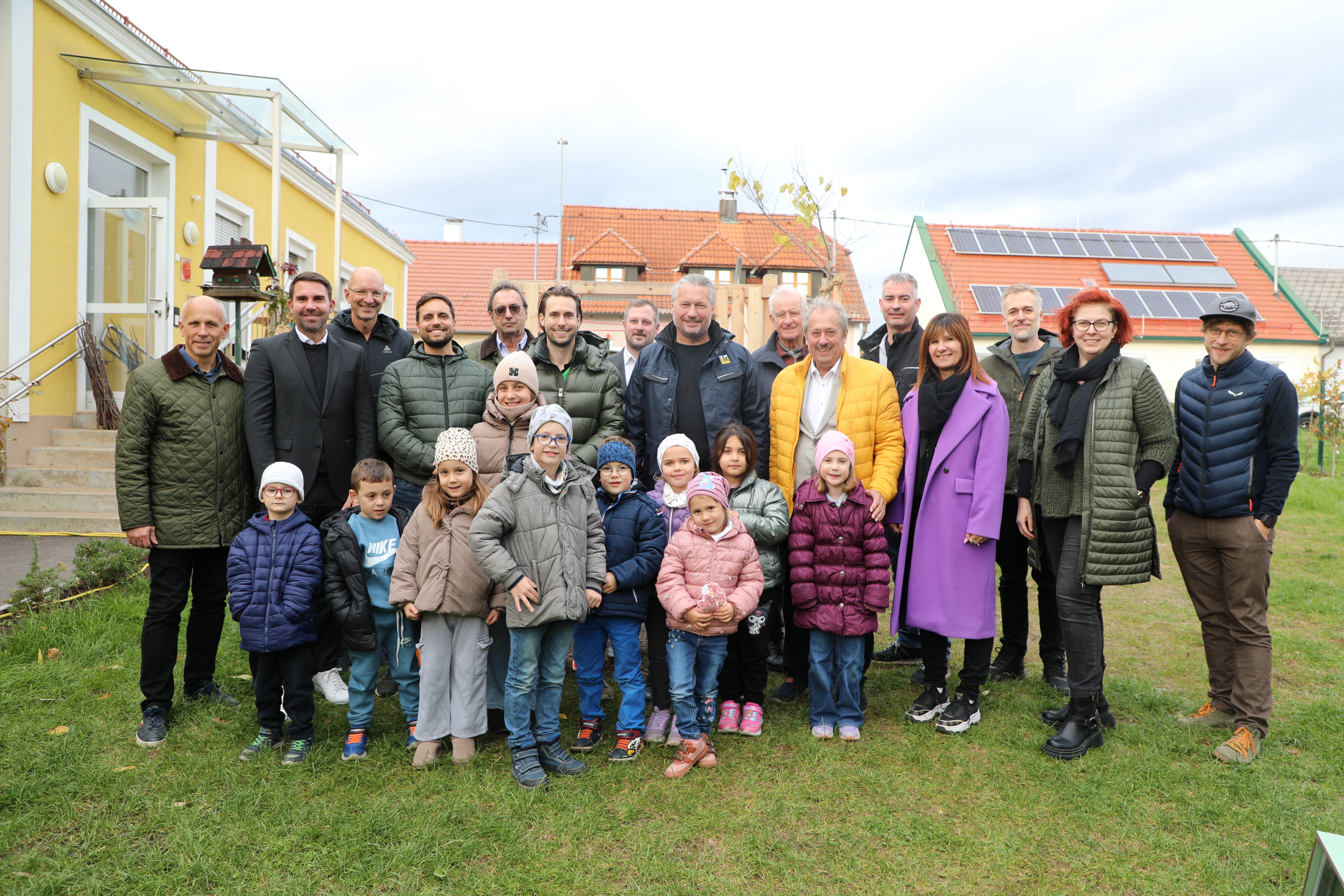 Vertreter:innen der Stadt Krems, Kindergarteninspektorin Elisabeth Heiß und die Baumpat:innen freuen sich gemeinsam mit den Kindergartenkindern über den neugestalteten Außenbereich des Kindergartens Gneixendorf.