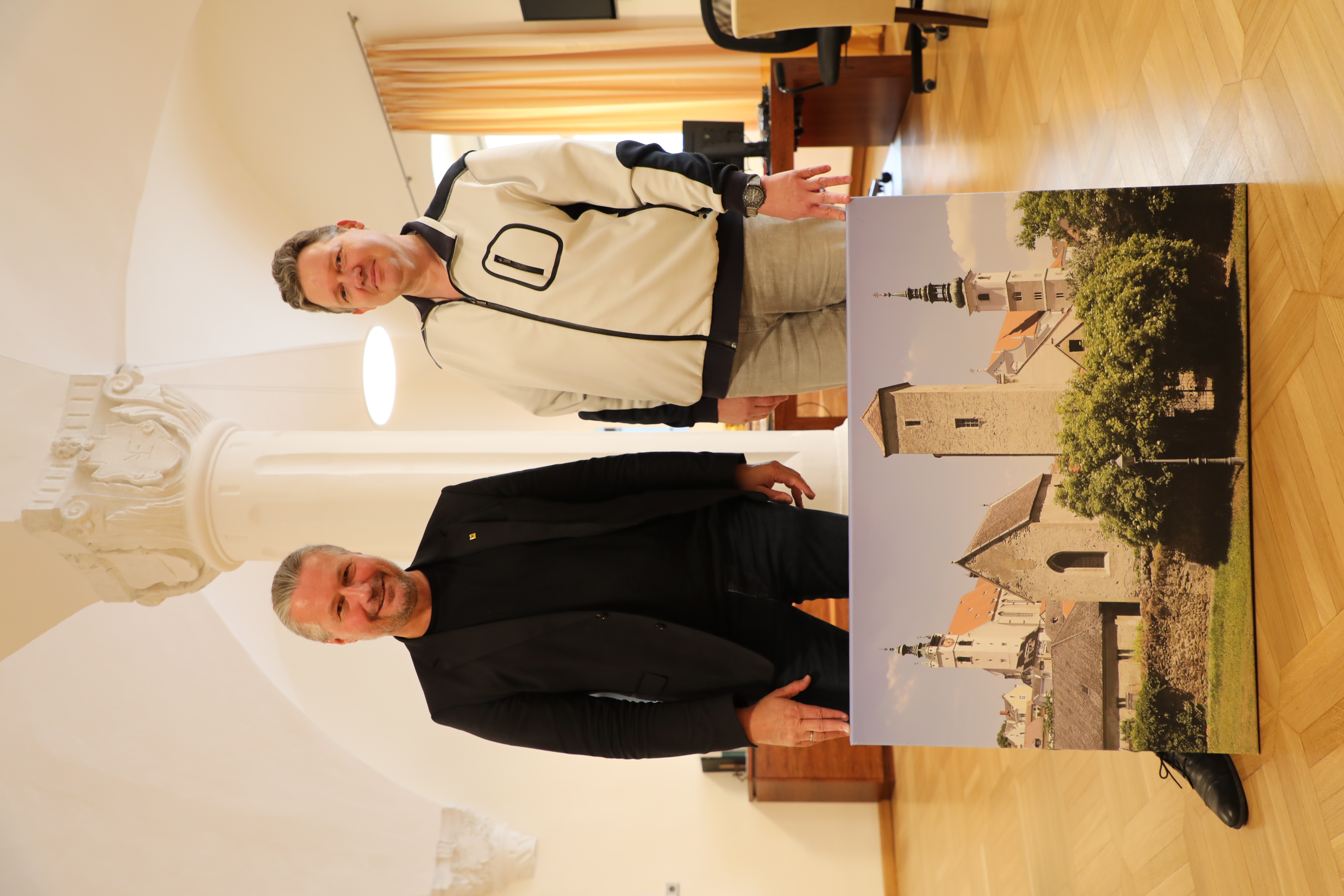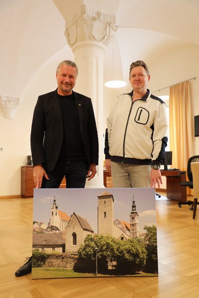 Als Dank für die gelungene Buchpräsentation im Rathaus überreichte Fotograf Franz Karl (r.) Bürgermeister Peter Molnar eine großformatige Fotografie von Piaristenkirche, Ursulakapelle und Dom der Wachau, aufgenommen im Dominikanerpark.