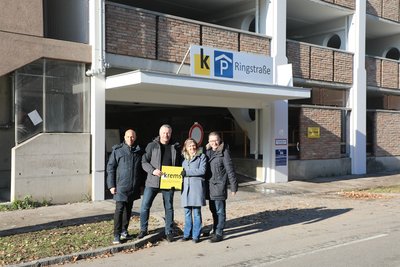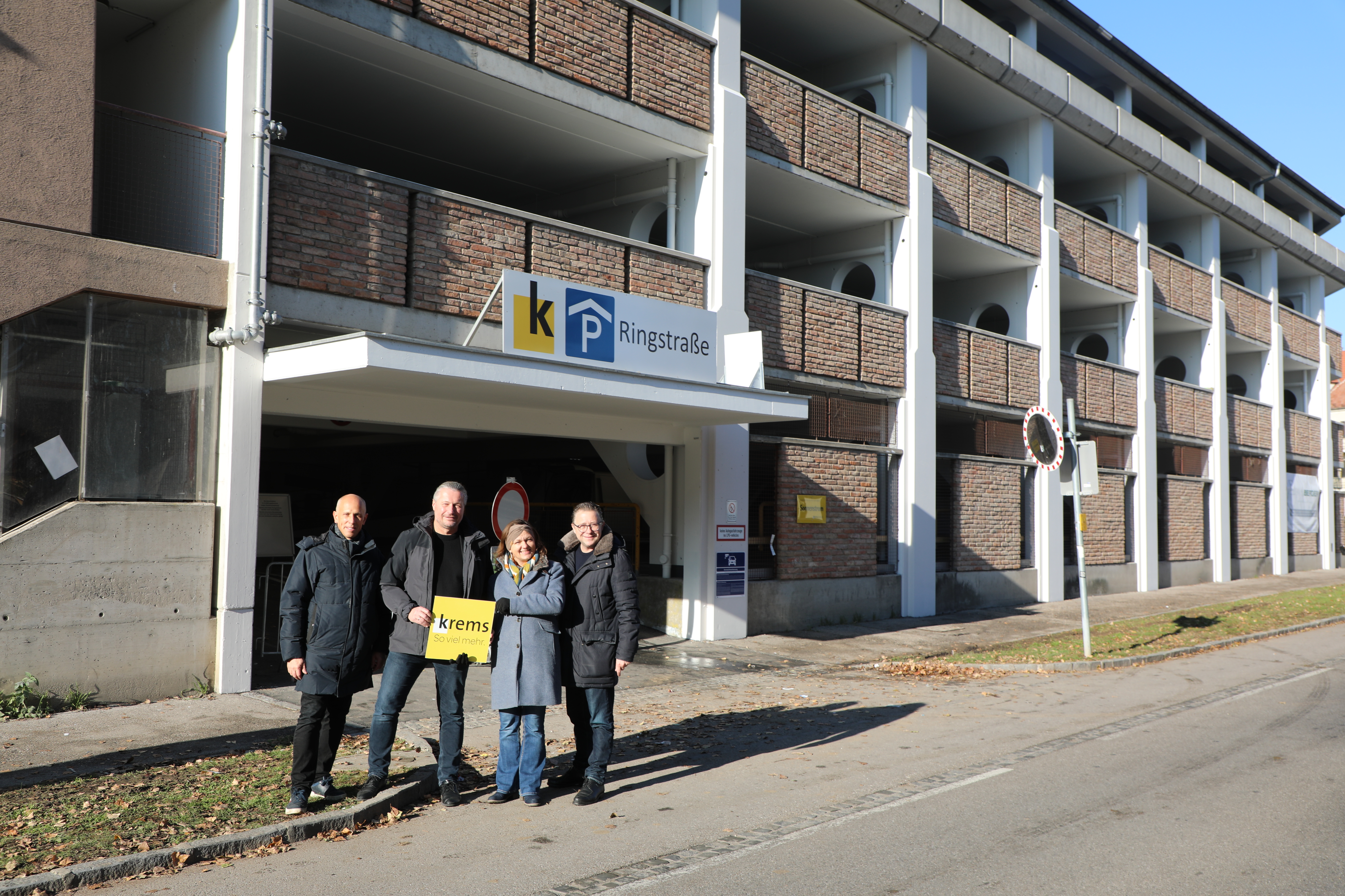 Freuen sich über die Fertigstellung des Parkdecks Ringstraße: Hannes Zimmermann (Geschäftsführer der Kremser Immobiliengesellschaft), Bürgermeister Peter Molnar, Mobilitätsstadträtin Alexandra Ambrosch und Stadtmarketing-Geschäftsführer Horst Berger – von links.