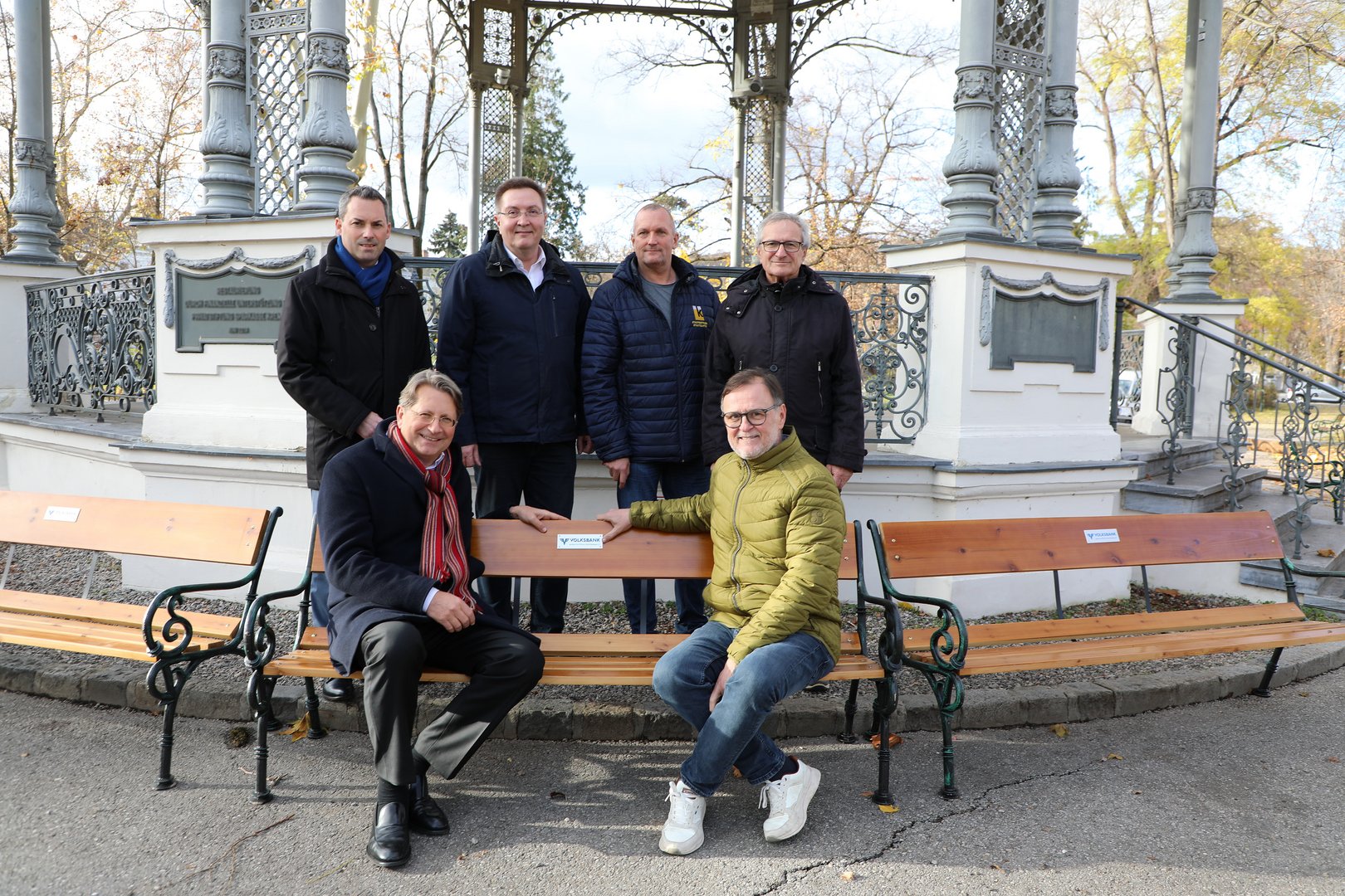 Offizielle Übergabe im Stadtpark: Vorstandsvorsitzender Rainer Kuhnle (Volksbank Niederösterreich) und Stadtrat Werner Stöberl (sitzend v. l.) sowie (stehend v. l.) die Vorstände Stefan Seif und Hermann Münzberg (VB Krems-Zwettl Beteiligung e.G.), Stadtgartenamtsleiter Eduard Pauer und Vorstand Herbert Aumüller (VB Krems-Zwettl Beteiligung e.G.).