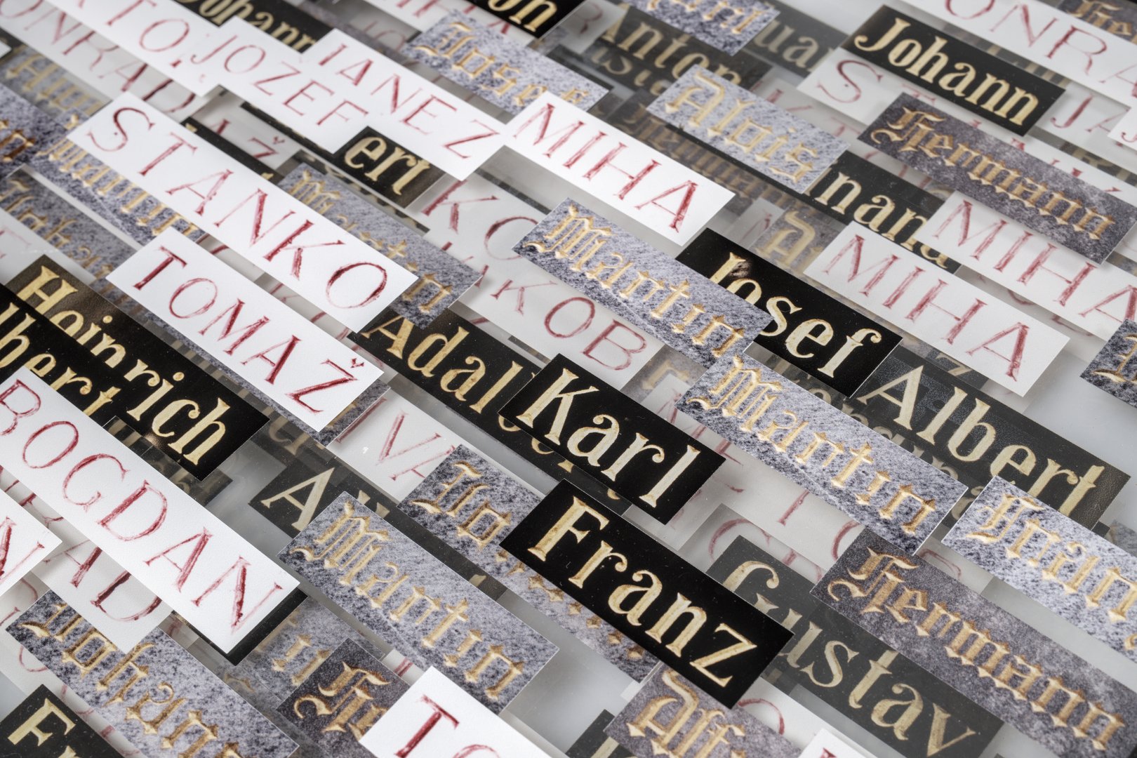 Ausstellungsfoto zeigt Namen von gefallenen Soldaten eines Kriegerdenkmals des Ersten Weltkrieges und wurde 2022 am Beginn des russischen Angriffkrieges in der Ukraine aufgenommen.