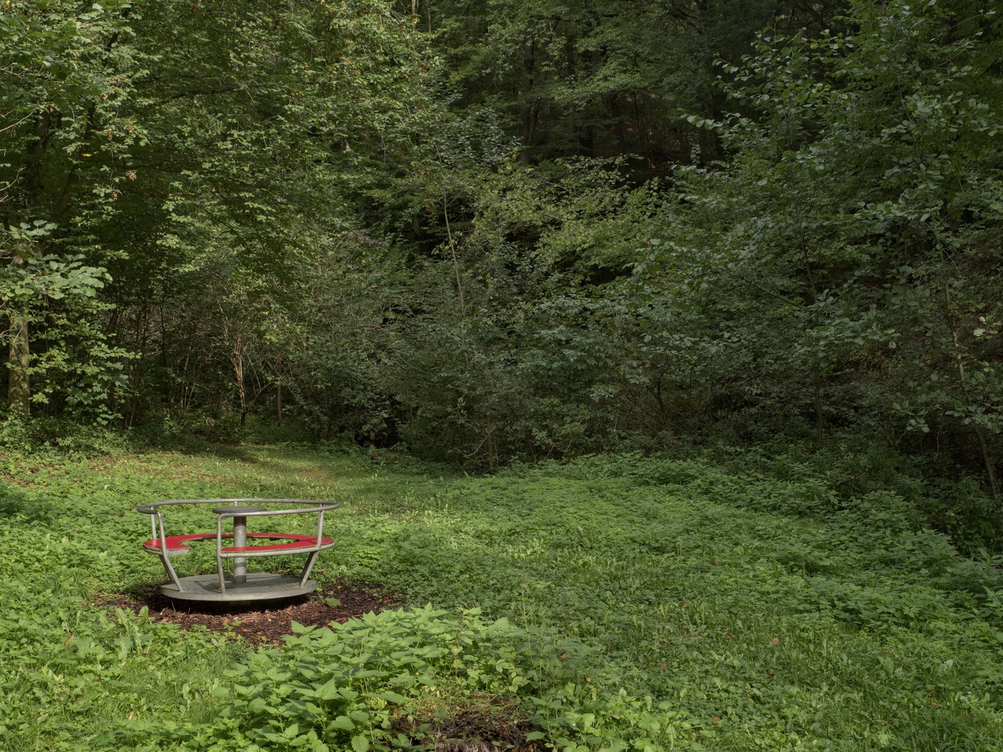 Ausstellungsfoto zeigt einen Spielplatz im Wald, der im Dialog mit den Namen der im Krieg Getöteten steht.