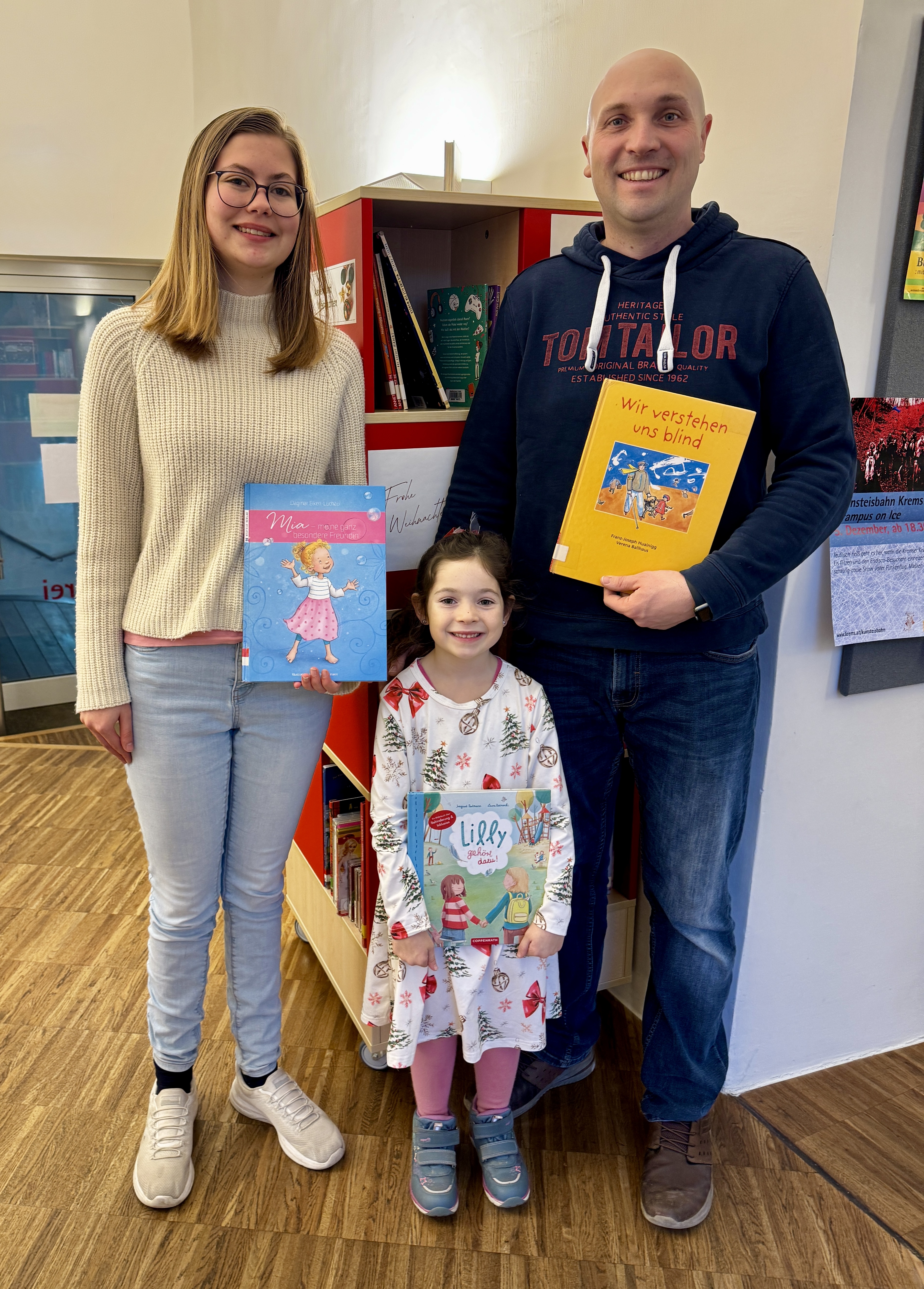 Janina Hönninger (Stadtbücherei Krems) und Behindertenbeauftragter Christoph Stricker sowie Kind Finja Steger.