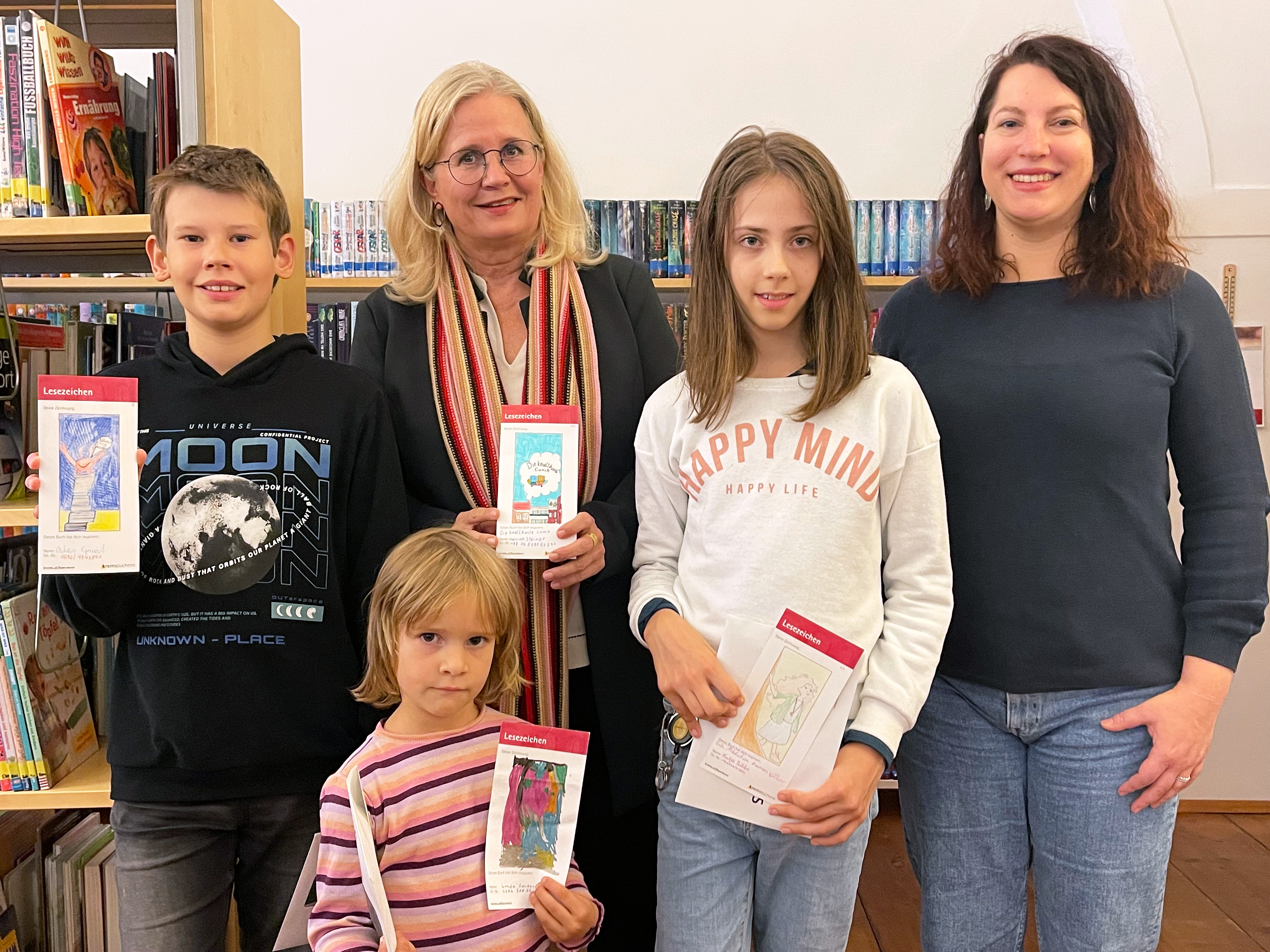 Oskar Gneist, Linda Sartori, Kulturgemeinderätin Elisabeth Kreuzhuber, Katja Pichler und Stadtbücherei-Leiterin Julia Nicolodi – von links. Nicht auf dem Foto: Hannah Steiner.