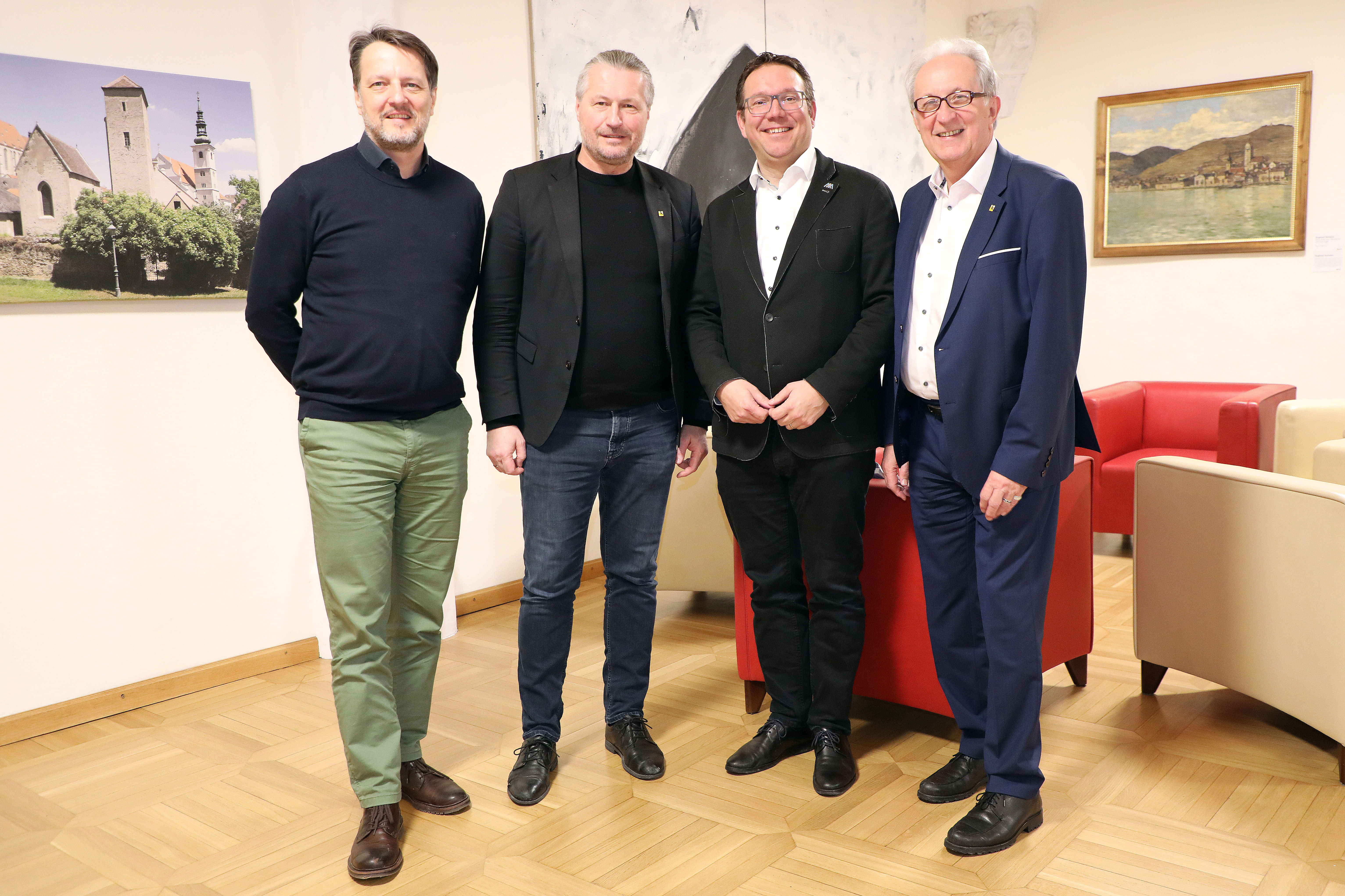 Arbeitsgespräch im Rathaus Krems: Vizebürgermeister Gerhard Riegler aus Amstetten, der Kremser Bürgermeister Peter Molnar und sein Amstettner Amtskollege Christian Haberhauer sowie der Kremser Baustadtrat Günter Herz – von links.