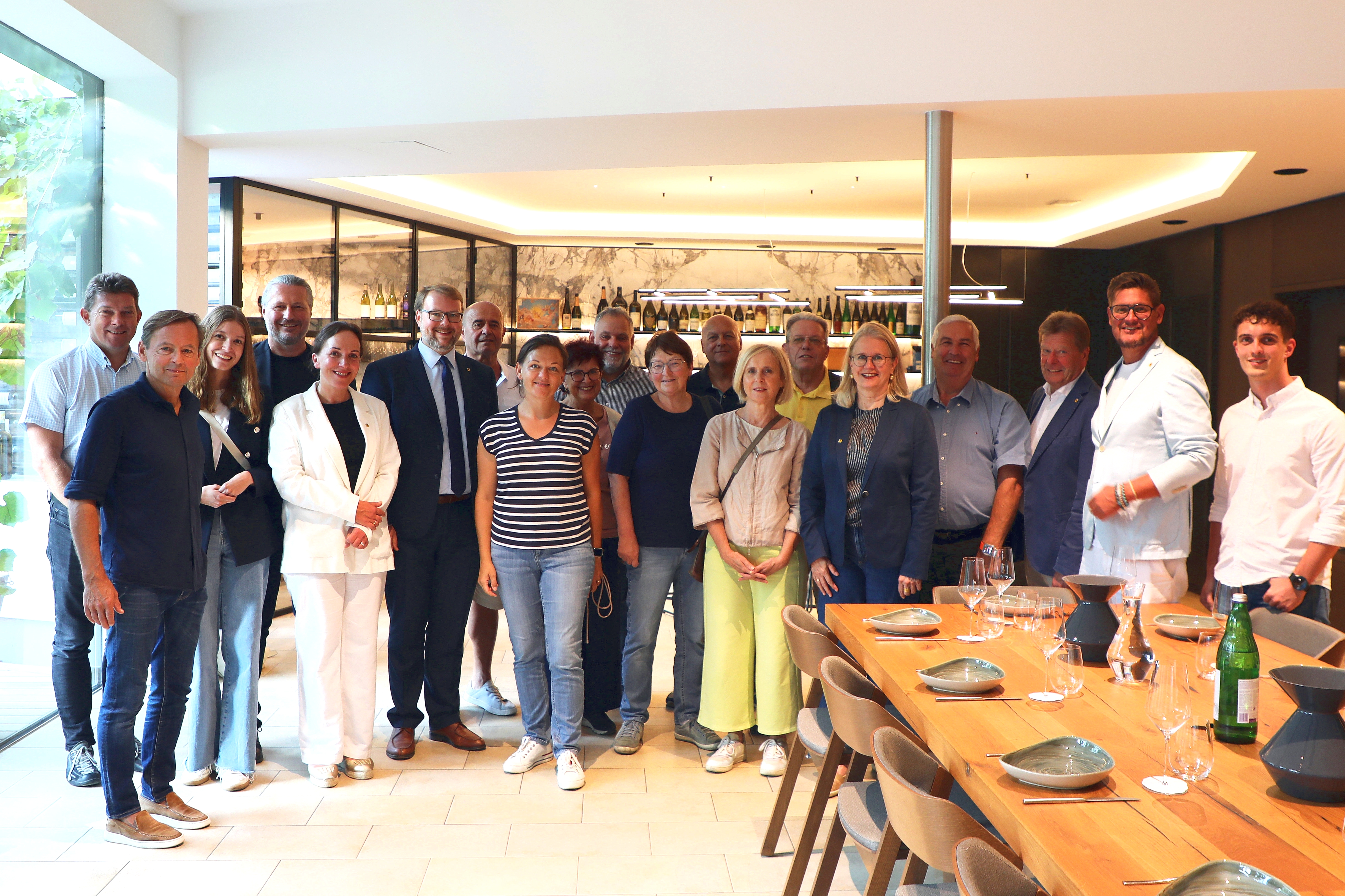 Magistratsdirektor Karl Hallbauer, Geschäftsführer Fritz Miesbauer (Weingut Stadt Krems), Bundesrätin Amelie Muthsam, Bürgermeister Peter Molnar, Stadträtin Bernadette Laister, Vizebürgermeister Florian Kamleitner, Gemeinderat Cornel-Constantin Prejban, Stadträtin Alexandra Ambrosch, Gemeinderätin Christa Eberl, Stadtrat Martin Sedelmaier, Gemeinderätin Edith Gruber, Bereichsleiter Roland Dewisch (Stadtbetriebe), Bereichsleiterin Doris Denk (Bildung, Kultur und Tourismus), Gemeinderat Wolfgang Mahrer, Gemeinderätin Elisabeth Kreuzhuber, Gemeinderat Andreas Ettenauer, Stadtrat Helmut Mayer, Gemeinderat Dominic Heinz und Tourenführer Lorenz Wölfl beim Lokalaugenschein im Weingut Stadt Krems.