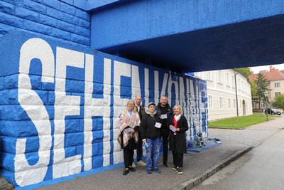 Künstlerin Käthe Löffelmann (Mitte) zusammen mit Kulturgemeinderätin Elisabeth Kreuzhuber, Kulturamtsleiter Gregor Kremser, Bürgermeister Peter Molnar und der Bereichsleiterin für Bildung, Kultur und Tourismus am Magistrat Krems, Doris Denk – von links.