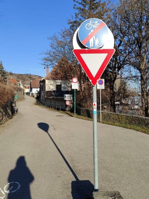 Im Zuge von Bauarbeiten wurde hier ein falsches Schild angebracht (Radweg). Das wurde nun richtiggestellt, es ist von Rothenhof kommend wieder ein Geh- und Radweg-Schild montiert.