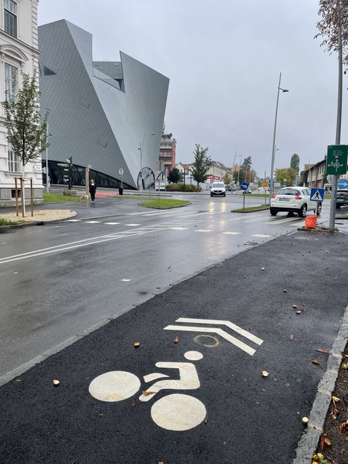 Auf dem neuen Radweg an der Südseite der Steiner Donaulände kurz vorm Franz-Zeller-Platz wurde ein Sharrow aufgebracht. Sharrows sind dazu gedacht, Autofahrende im Mischverkehr darauf aufmerksam zu machen, dass sie die Fahrbahn mit Radfahrenden teilen. Sie haben auf einem Radweg nichts verloren.