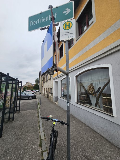 Bei der Bushaltestelle Steiner Friedhof sind an einem Haltestellenschild verschiedene Verkehrszeichen angebracht. Teilweise hängen die Schilder so tief, dass man sich am scharfkantigen Blech den Schädel aufhaut. Gem. § 48 StVO 1960 beträgt die Mindesthöhe 2,2 m über dem Gehsteig.