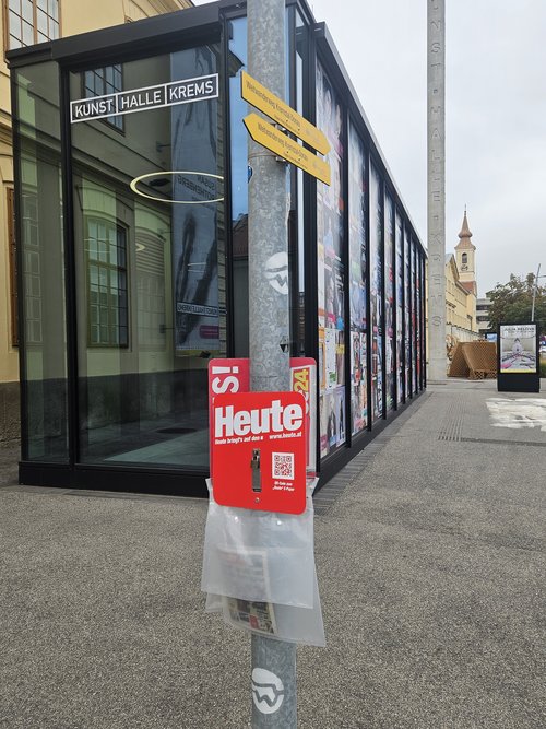 Laut Auskunft der Ortspolizei gilt gem. § 31 StVO 1960 folgendes: 1. (1)Einrichtungen zur Regelung und Sicherung des Verkehrs (insbesondere Verkehrsampeln, Signalscheiben, Straßenverkehrszeichen, Verkehrsleiteinrichtungen, Leiteinrichtungen für Menschen mit Sehbehinderung, Sockel für Verkehrsposten, Verkehrstürme, Schutzinseln, Sperrketten, Geländer, Begrenzungspfeiler, Randsteine, radableitende Randbegrenzungen, Straßenbeleuchtungseinrichtungen, Schneegatter, Verkehrsspiegel und das allenfalls mit solchen Einrichtungen verbundene Rückstrahlmaterial) dürfen nicht beschädigt oder unbefugt angebracht, entfernt, verdeckt oder in ihrer Lage oder Bedeutung verändert werden. 2. (2) Es ist verboten, an den in Abs. 1 bezeichneten Einrichtungen Beschriftungen, bildliche Darstellungen, Anschläge, geschäftliche Anpreisungen oder dgl. anzubringen. Dies gilt jedoch nicht für das Anbringen von Tabellen für Preise von Taxi- und Ausflugsfahrten unter den in § 96 Abs. 4 genannten Straßenverkehrszeichen, für die Nutzung der Rückseite der in Abs. 1 bezeichneten Einrichtungen gemäß § 82 Abs. 3 lit. f sowie bei Vorliegen einer Bewilligung nach den §§ 82 bis 84. 3. (3) Die Behörde ist berechtigt, unbefugt an den in Abs. 1 bezeichneten Einrichtungen angebrachte Beschriftungen, bildliche Darstellungen, Anschläge, geschäftliche Anpreisungen oder dgl. auf Kosten des für die Anbringung Verantwortlichen ohne weiteres Verfahren entfernen zu lassen. Ich ersuche um Mitteilung, welche Ausnahmebewilligung bei den zahlreichen Zeitungsständern im Stadtgebiet vorliegt vorliegt. Andernfalls ist die Einhaltung der StVO durchzusetzen.