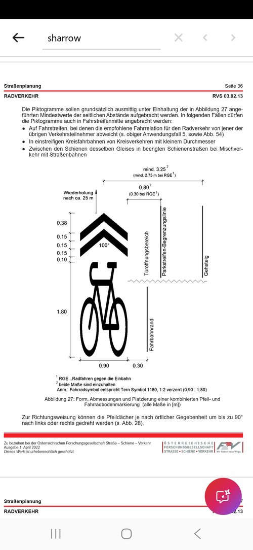 Die neu markierten Sharrows auf der Donaulände entsprechen nicht den den RRVS 03.02.13 S. 36 Sie sind im konkreten Fall 17 bis 19 cm neben dem Fahrbahnrand markiert, müssen aber 0,3 m entfernt sein. Bitte um Abänderung für eine sichere und den Vorschriften entsprechende Radverkehrsführung!