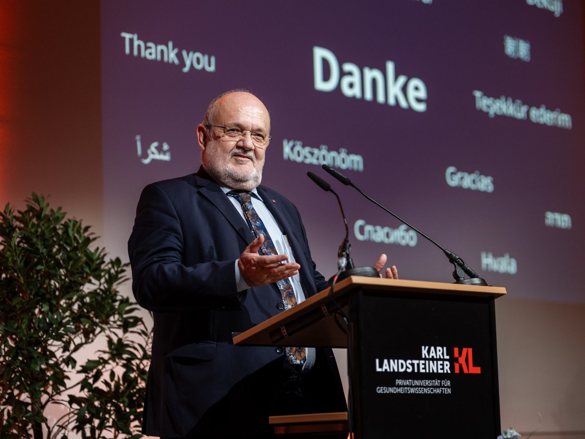 In seiner Abschiedsrede bedankte sich Rudolf Mallinger bei allen Wegbegleiter:innen: „Die KL ist das Werk vieler. Mein aufrichtiger Dank gilt allen, die an diese Idee geglaubt und sie mitgetragen haben.“ Als Anerkennung seiner Verdienste wurde das Auditorium der Karl Landsteiner Privatuniversität offiziell nach dem Gründungsrektor benannt. Die symbolische Übergabe des neuen Schriftzugs erfolgte durch LH-Stellvertreter Pernkopf und Prorektorin Sabine Siegl-Amerer.